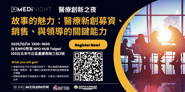 由北醫生醫加速器邀請到Day 2 Studios 進行分享及帶領實作,將為生技與醫療領域的創始人提供寶貴的工具,協助您們將科學內容轉化為能夠引起共鳴的故事,從而在募資、銷售和領導力方面取得成功。