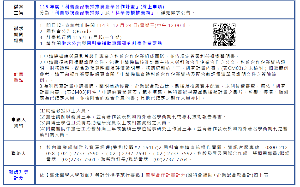敬致全校教師、研究人員、三院研究部及事業發展部: 國科會115年度「科普產品製播推廣產學合作計畫」,徵案說明如下表,校內截止日為114年12月24日中午12點止, 因準備的文件多,若有意願申請之PI請先準備,若有問題請先與事業處討論。